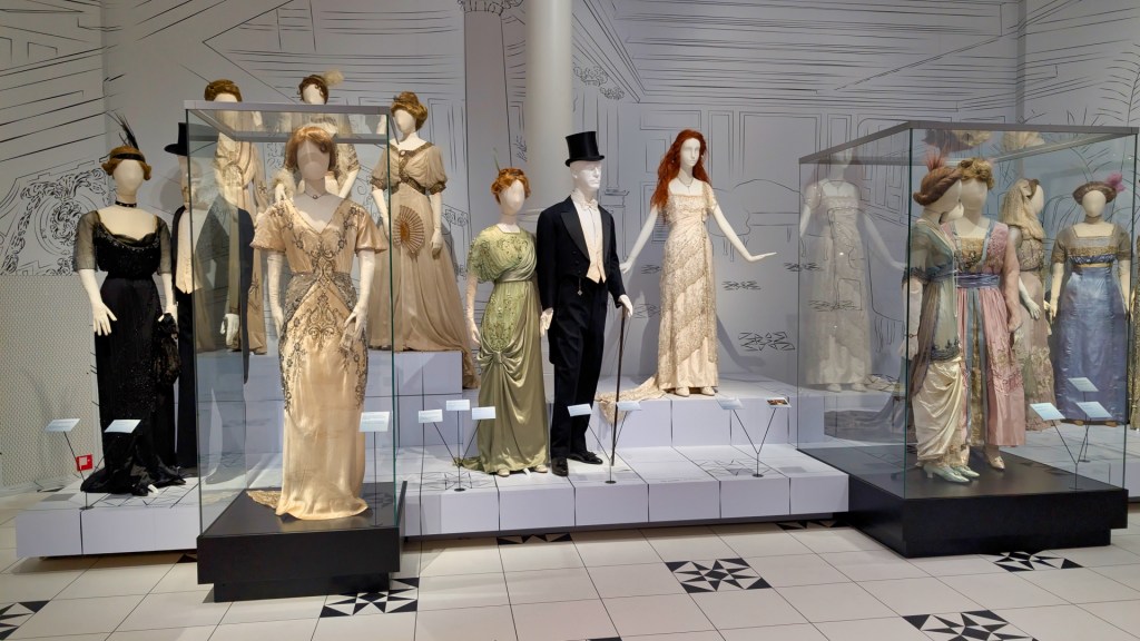 In de eerste zaal zie ik de jurken uit de film Titanic. Ze zijn echt indrukwekkend. Ze hebben glanzende stoffen, mooie details en alles tot in de puntjes verzorgd. Maar wat me vooral opvalt, is dat er ook werkkleding van de bemanning hangt. Stevige schoenen, zelfs klompen, uniformen en eenvoudige stoffen.