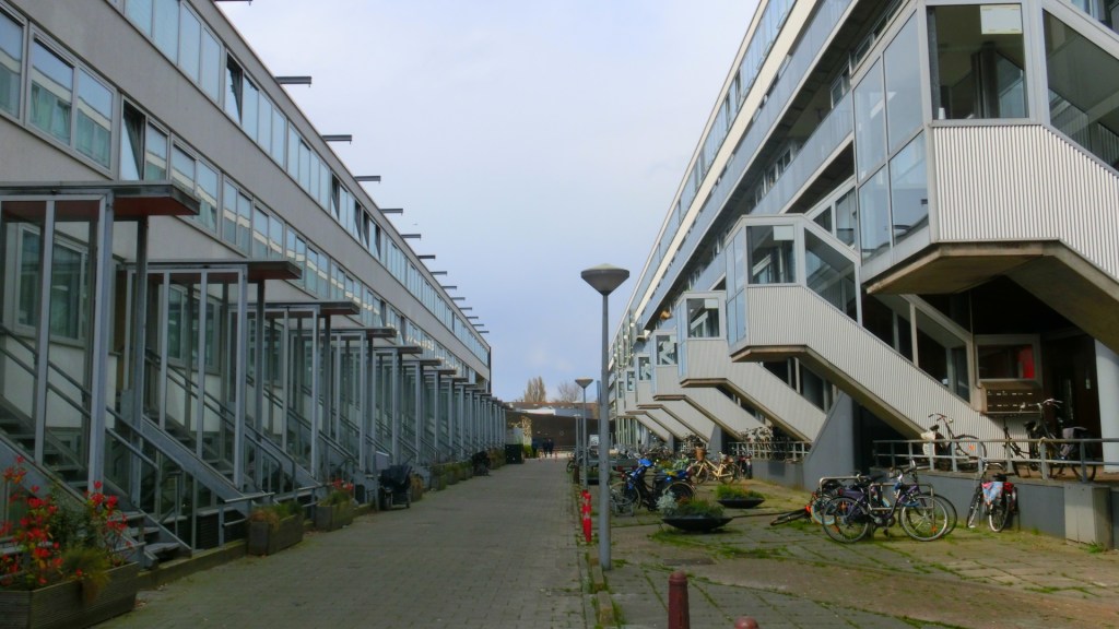 In Amsterdam-Noord loop ik langs de Ketelmakerij. De woningen hier zijn bekend van de jeugdserie Dunya & Desi, die ik vroeger altijd graag keek. Het gaat over twee Amsterdamse meisjes die hun puberproblemen beleven in Noord. De huizen met de dwarstrappen zijn ontworpen door OMA, het bureau van architect Rem Koolhaas. Het is interessant om te zien hoe wat vroeger modern en experimenteel was, nu gewoon onderdeel van de wijk is geworden.