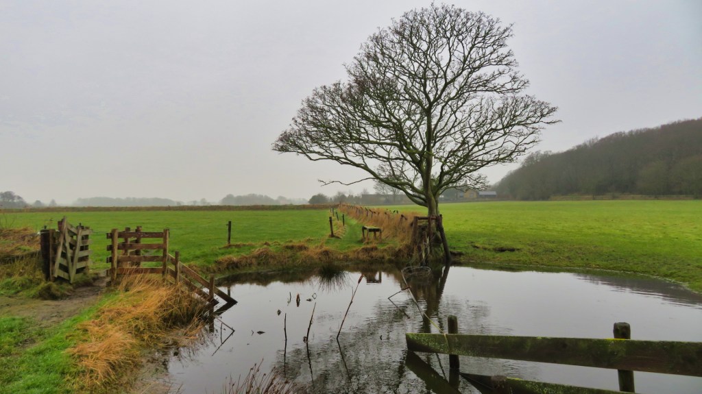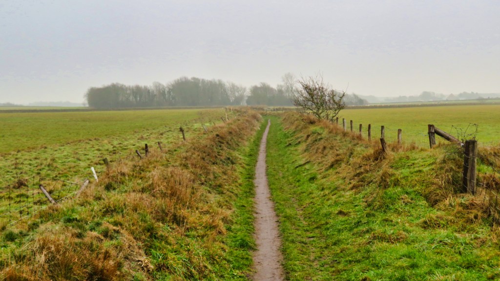 Na een tijdje kom ik langs een kleine begraafplaats en vervolg ik mijn route door de open weilanden. De paden lopen dicht langs boerenland en zijn duidelijk afgezet met hekken, zodat je precies ziet waar je wel en niet mag lopen. Even denk ik dat ik een blaffende boerderijhond tegenkom, maar gelukkig is er geen hond te bekennen.