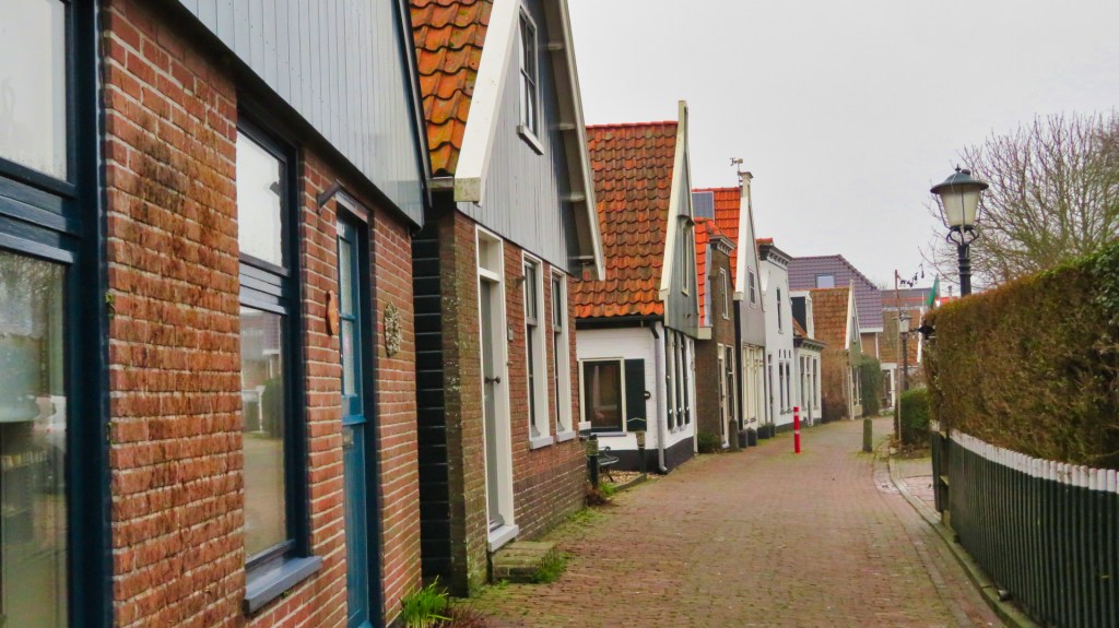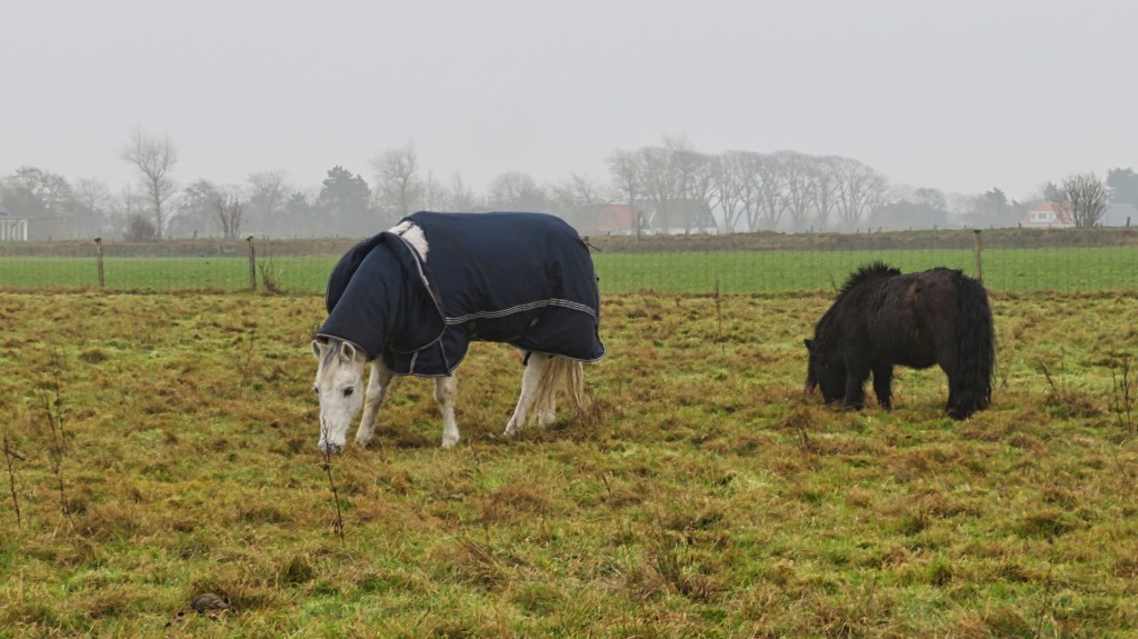 Het is grijs als ik de deur van mijn B&B in Den Burg achter me dichttrek. Het is koud en winderig en er is geen zon te zien. De paarden in de wei dragen een jasje, wat meteen laat zien hoe guur het weer is. Ik start mijn 13 kilometer lange wandeling, de Trage Tocht Texel vanuit Den Burg, direct vanaf de B&B en loop het centrum van Den Burg in. De winkels zijn nog dicht en de straten liggen er stil bij. Ik passeer het gemeentehuis en een klein industrieterrein. Al snel ben ik aan de buitenrand van het dorp.