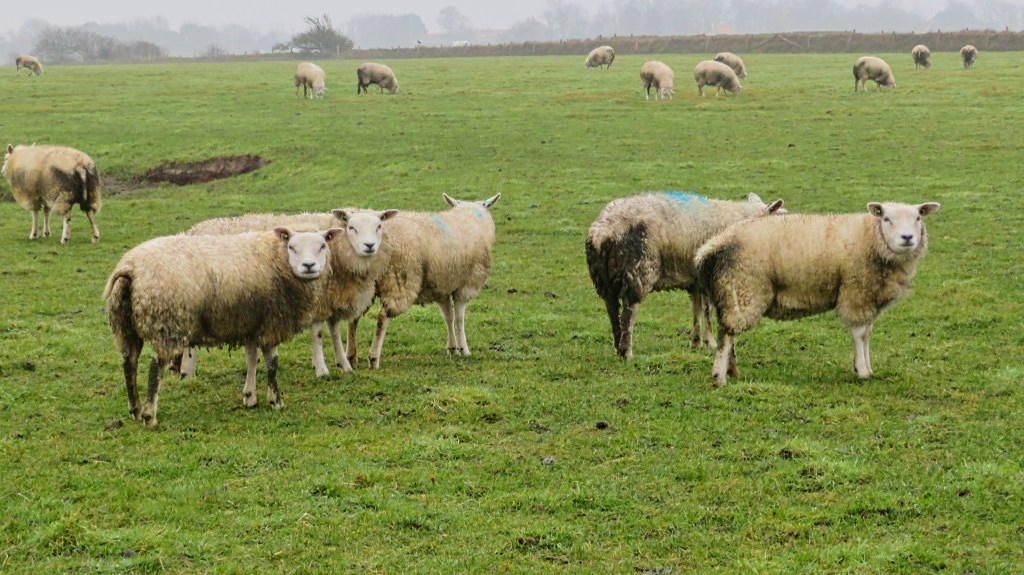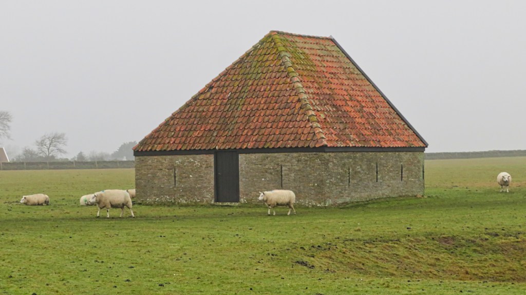 Zodra ik het dorp uitloop, verandert het landschap meteen. De paden zijn drassig en slingeren tussen uitgestrekte weilanden, waar aan beide kanten Texelse schapen grazen. Het zijn stevige dieren met brede koppen en normaal gesproken witte wol, al oogt die met dit weer iets minder wit. Tussen de weilanden staan ook de karakteristieke schapenboeten: kleine houten schuurtjes met een schuin dak, vroeger gebruikt om hooi en gereedschap in op te slaan.