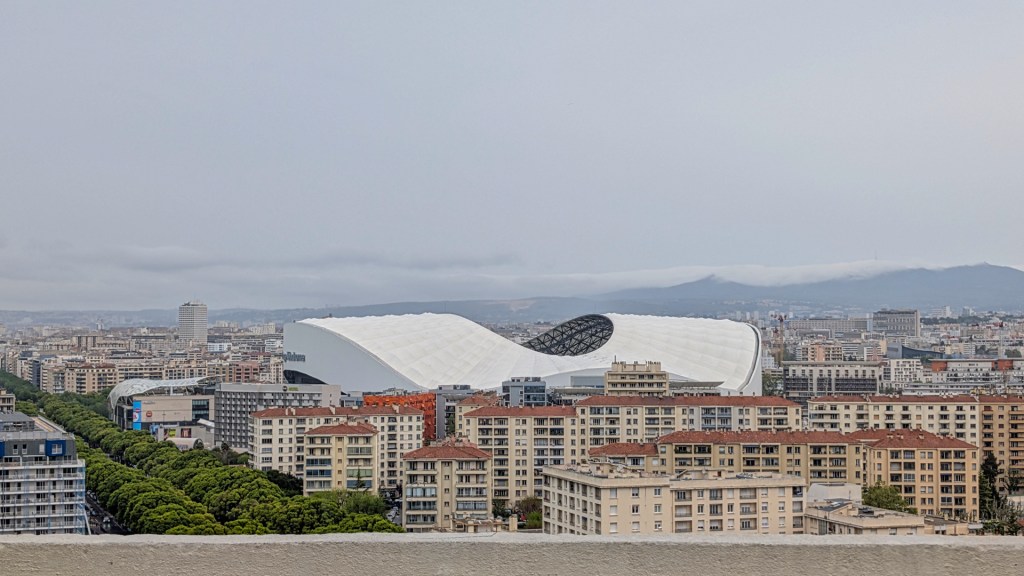Ik stap uit bij een groot winkelcentrum en tijdens mijn wandeling van 20 minuten naar het Unesco Werelderfgoed van de Franse architect Le Corbusier passeer ik het stadion Orange Velodrome van de Marseillese voetbalclub Olympic Marseille. Ik wandel onder de platanen over de Avenue du Prado, een 3,4 kilometer lange verkeersader die het 6de en 8de arrondissement verbindt.