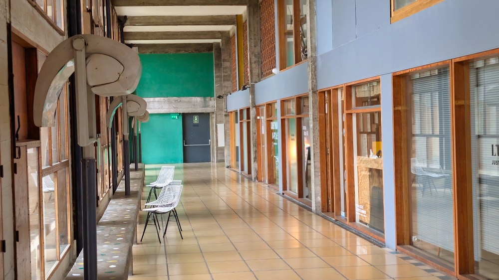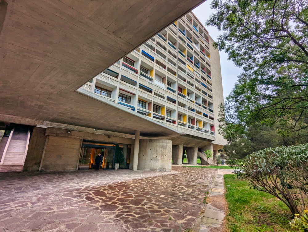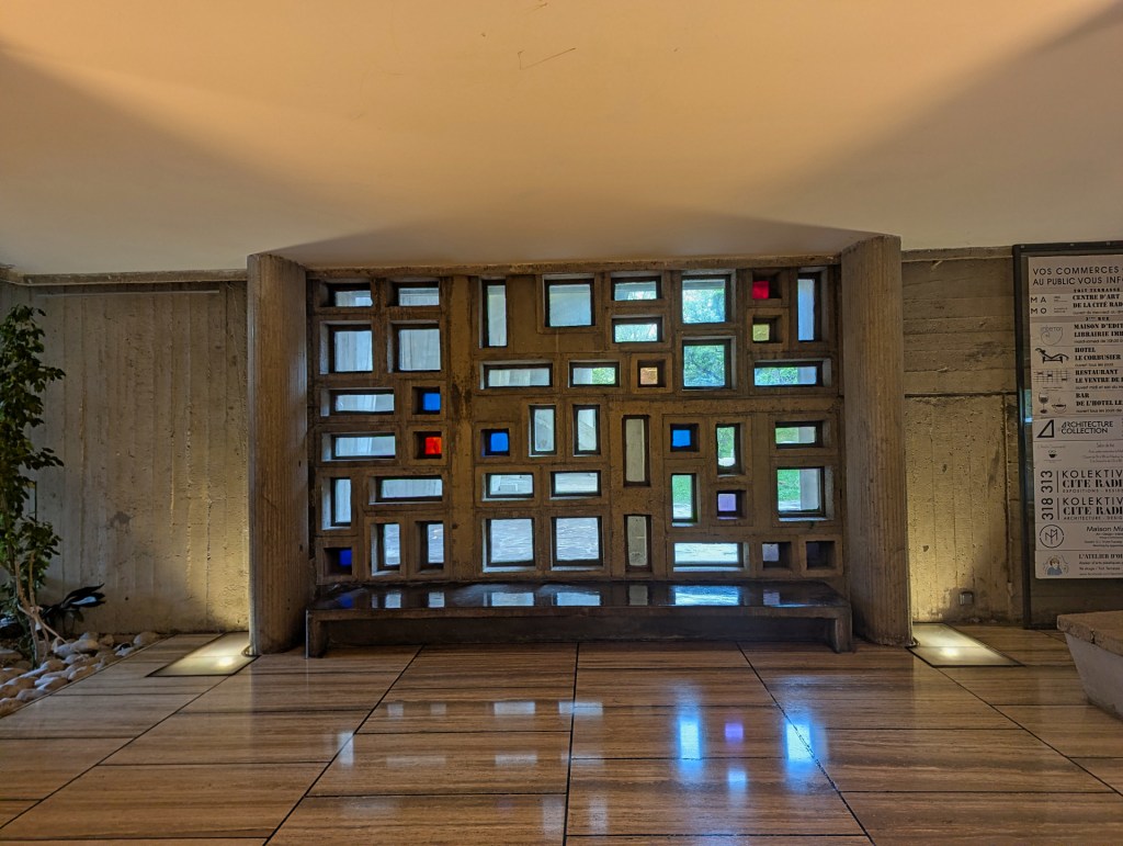 Na een wandeling van 20 minuten kom ik aan bij het meesterwerk van de Franse architect. Het betonnen kolos met de gekleurde raampartijen steekt boven de bomen uit. Ik wandel door een parkje naar de ingang van het appartementencomplex uit 1952. Het telt negen verdiepingen. In de hal wacht een groepje toeristen voor een rondleiding, die hier regelmatig wordt gegeven. Ik loop naar de receptionist en ik vraag of ik het gebouw mag bezichtigen. Hij vraagt me of ik registratielijst wil invullen en vertelt me dat ik de 3de, 4de en 9de verdieping mag bezoeken. De andere verdiepingen zijn niet publiek toegankelijk vanwege het respect voor de bewoners.