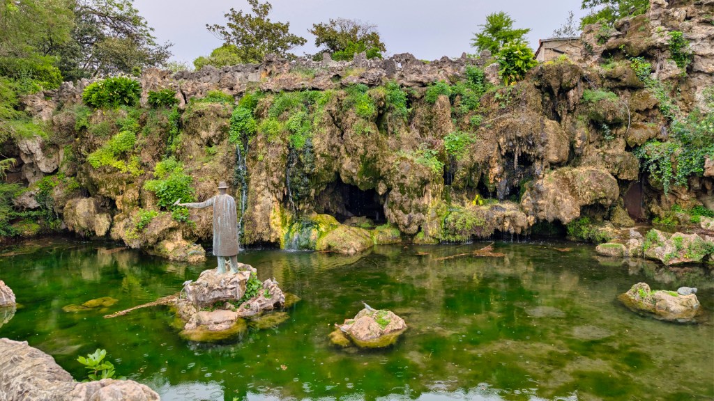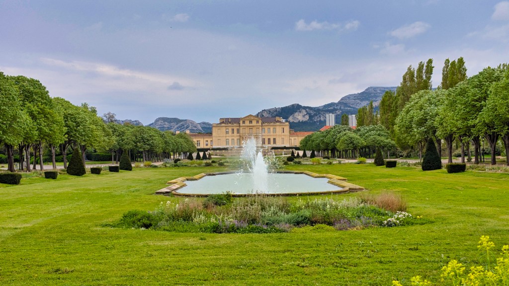 Bij een brug over het water kom ik bij de ingang van het Parc Borély. Bij de ingang heb ik meteen een mooi uitzicht op het kasteel Borély, dat vroeger van een rijke familie was.