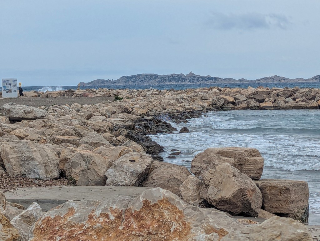 Ik vervolg mijn route richting de Middellandse Zee kust en ik kom uit bij de Prado stranden. Op de boulevard is het nog voorseizoen en het reuzenrad staat nog stil. Daar achter gaat de zee wild tekeer. De golven ketsen tegen de rotsen. In de verte zie ik een klasje met surfers en nog verder de schermen van windsurfers. Met mooi weer kom ik zeker weer terug naar de kust. Ik pak de bus 19 richting het centrum van Marseille.
