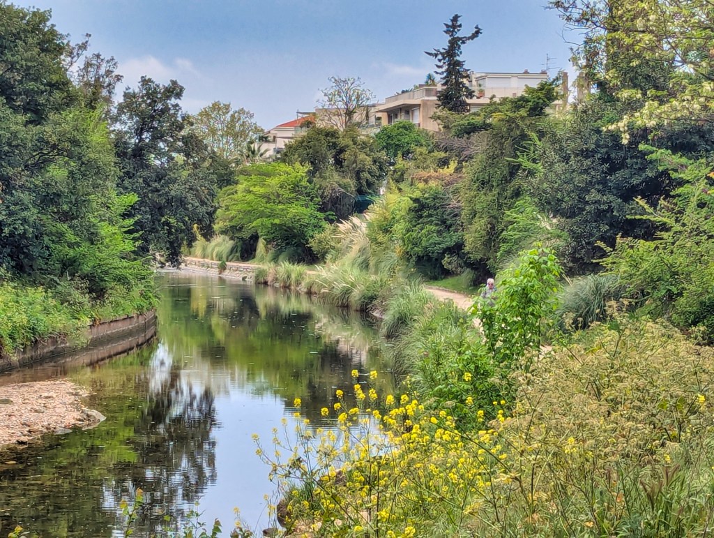 Omdat het nog vroeg is, heb ik nog een wandeling op het programma staan. Op internet heb ik gevonden, dat je vanaf La Cité Radieuse gemakkelijk via de Franse rivier de Huveaune naar de Middellandse zee kunt wandelen. Na 10 minuten neem ik het wandelpad langs de rivier, dat eerst nog droog lijkt, maar na een aantal minuten wandelen begint het echt op een stroompje te lijken.