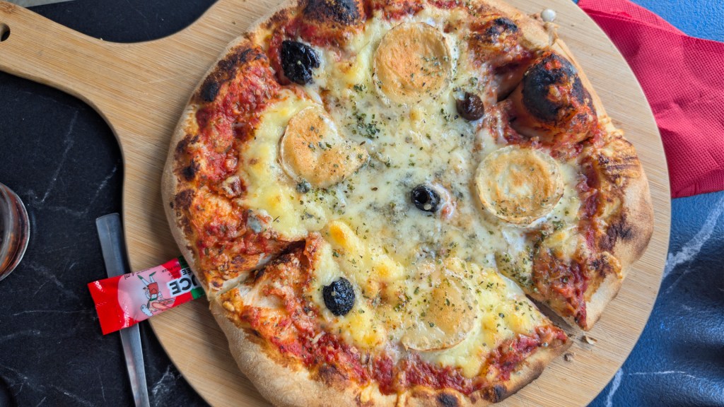 Het is lunchtijd en ik strijk neer voor een pizza quattro formaggi. Na al het stijgen en dalen gaat dat er goed in.