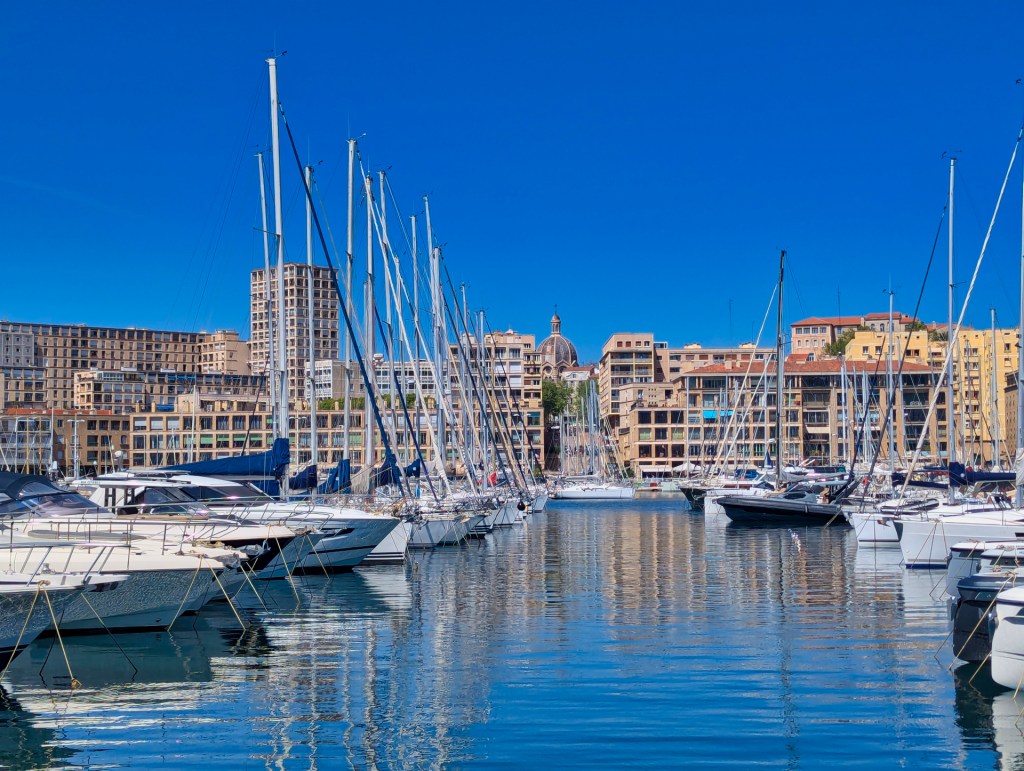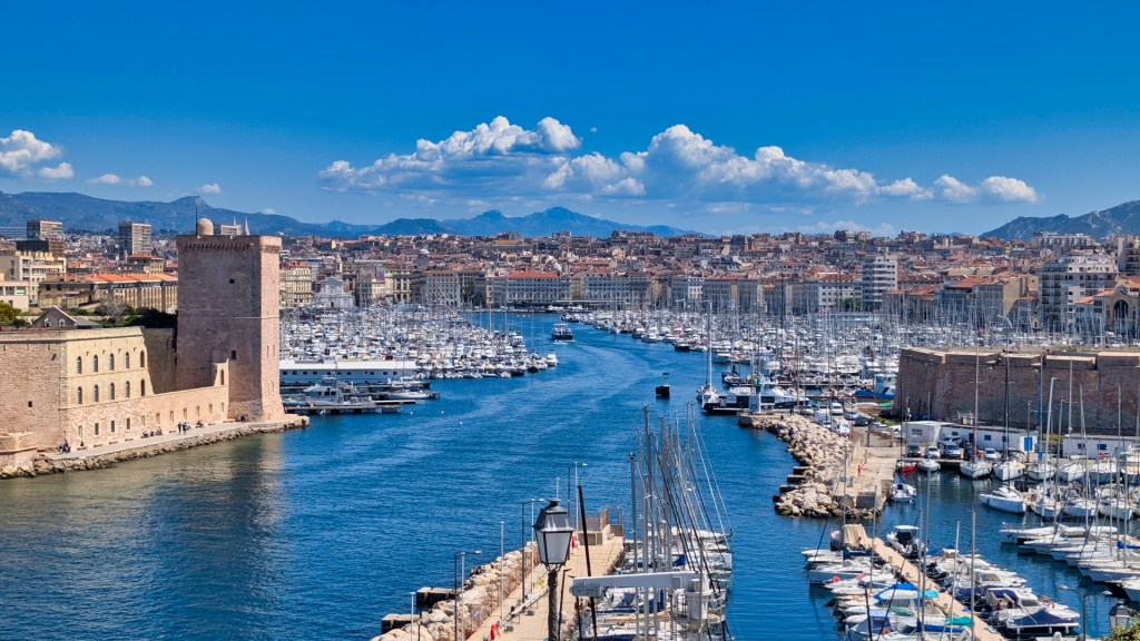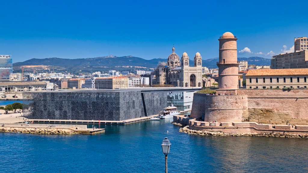 Vanaf hier kijk ik uit op de oude haven, het museum Mucem en de basiliek Notre-Dame de la Garde. Het Mucem staat bekend om zijn moderne architectuur en Notre-Dame de la Garde is een belangrijk herkenningspunt hoog boven de stad. Ik blijf hier even zitten en neem alles in me op.