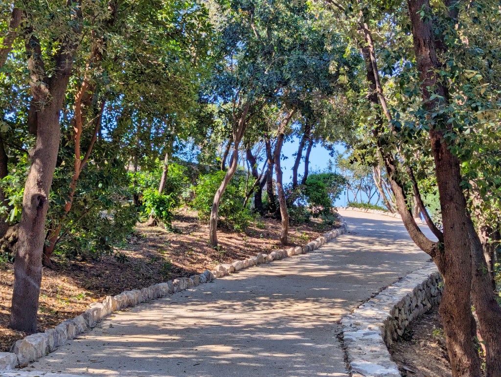 Via witte trappen daal ik naar beneden en kom bij een uitkijkpunt met een fraai uitzicht op de Middellandse Zee. Dit soort uitzichtpunten langs de kust liggen vaak op oude villa- of parkgrond en zijn opengehouden zodat iedereen van het uitzicht kan genieten.
