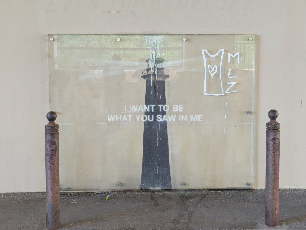 Ik maak een klein uitstapje naar een werk van Banksy. Het is even zoeken naar de vuurtoren met de tekst “I want to be what you saw in me”. Het werk is beschermd met plexiglas, al zit er alweer een nieuwe tag op.