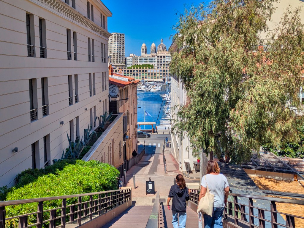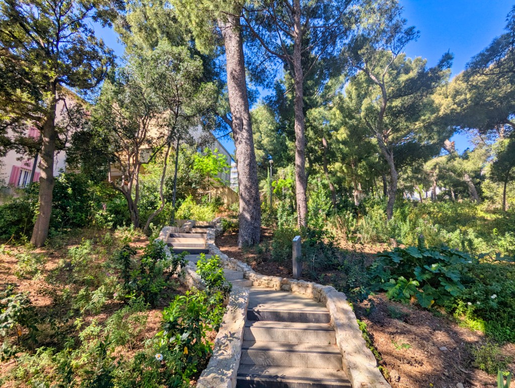 Via normale trappen verlaat ik gelukkig de heuvel en wandel ik weer richting de stad. Mijn volgende stop is Jardin de la Colline Puget, het oudste park van Marseille. Ik volg slingerende paden door het groen en daal langzaam af richting de oude haven.