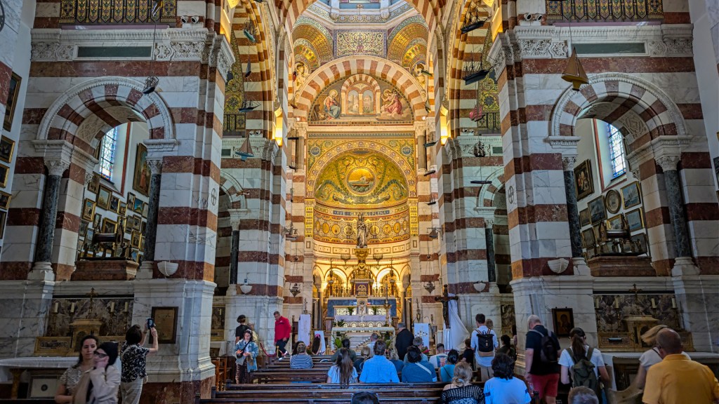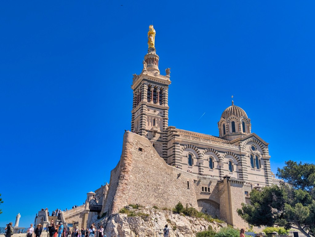 Maar eenmaal boven ben ik de angst snel vergeten. Het uitzicht over Marseille is prachtig. Ik neem de tijd om rond te kijken en bezoek ook de basiliek en de crypte.
