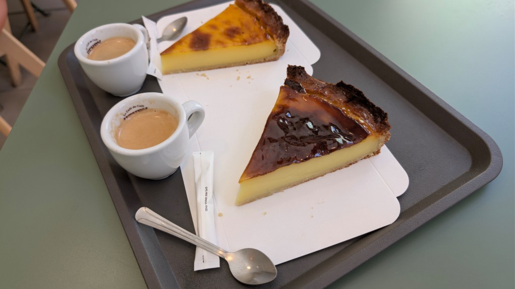 Even later neem ik pauze bij een bakkerij. Ik bestel een flan en een espresso, precies wat ik nodig heb tijdens deze ontspannen wandeling.