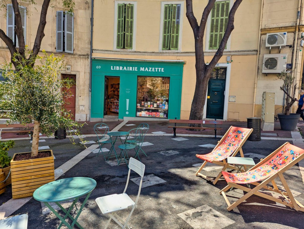 Daarna begint het stijgen echt. Ik kom in een schilderachtig deel van Vauban en op een pleintje zie ik Librairie Mazette. De mintgroene gevel en de stoelen buiten nodigen uit om even te blijven hangen met een boek en een kop koffie. Ik loop echter door naar de top van de Notre-Dame de la Garde.