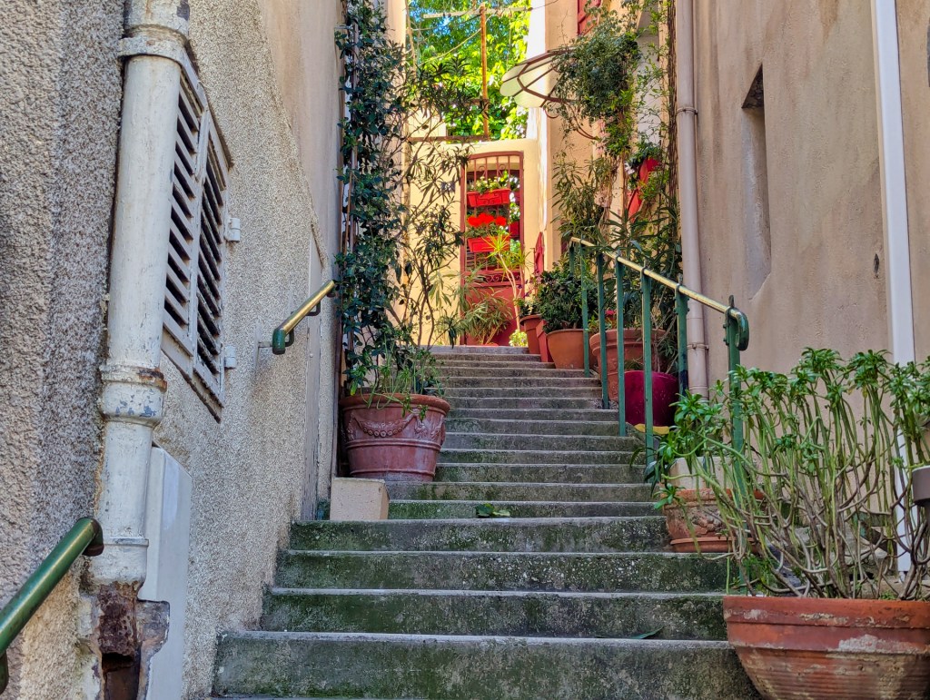 De weg wordt steiler en via stenen trappen ga ik langzaam omhoog. Regelmatig sta ik stil om van het uitzicht op de Middellandse Zee te genieten. Onderweg zie ik een gitzwarte kat. Ik hoop hem te aaien, maar hij is me te snel af en verdwijnt naar boven.